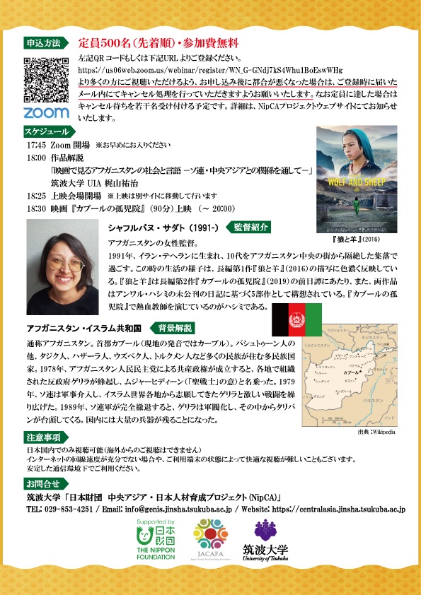 この度、筑波大学「日本財団 中央アジア・日本人材育成プロジェクト (NipCA)」は、中央アジアの文化とSDGsへの理解促進のため、オンラインによるロシア・中央アジア映画上映会を開催することになりました。