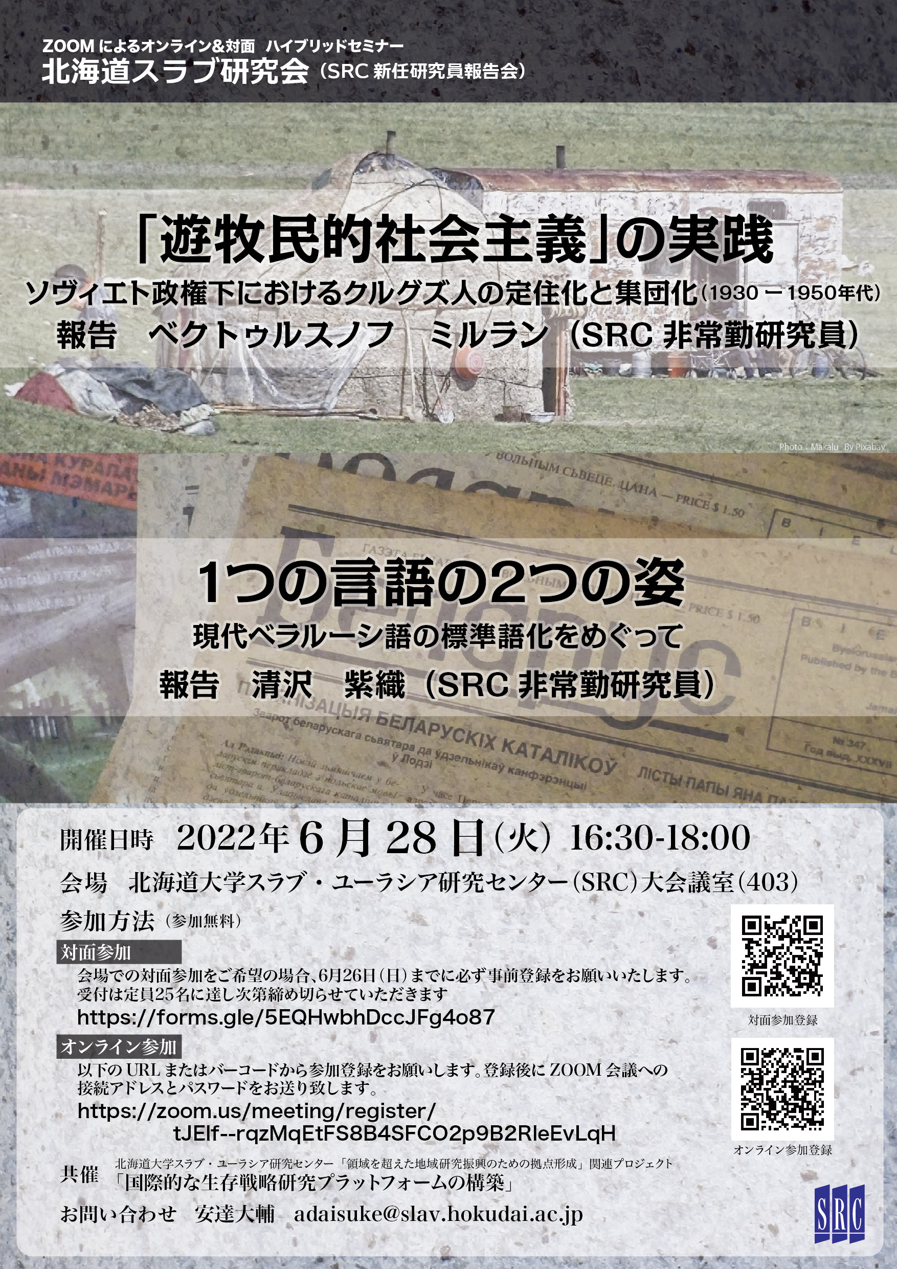北海道スラブ研究会では、スラブ・ユーラシア研究センターに新しく着任された非常勤研究員のお二人にご講演をお願いします。皆さまのご参加をお待ちしています。