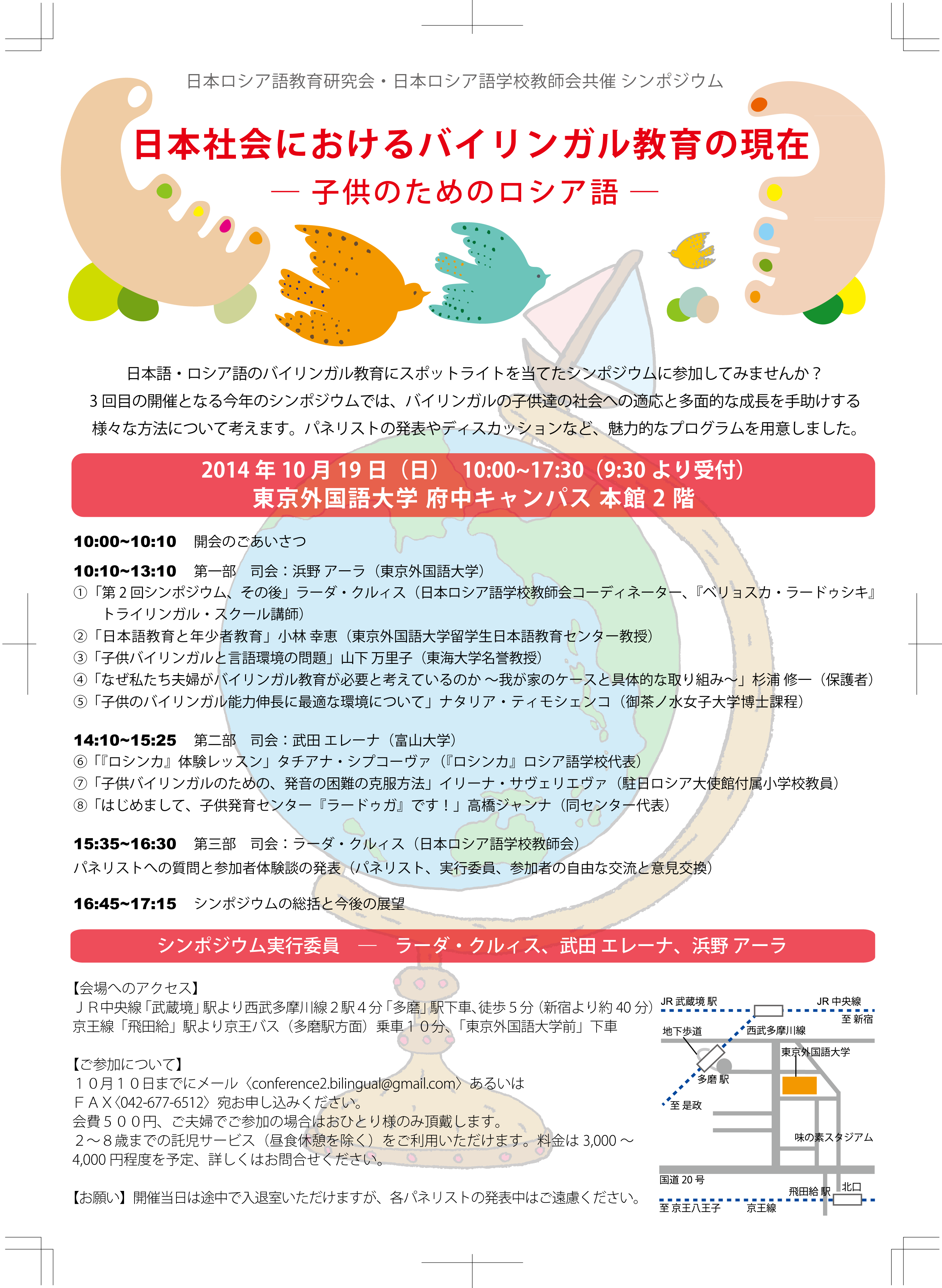2014年10月19日(日)、東京外国語大学にて国際シンポジウム「日本社会におけるバイリンガル教育の現在―子供のためのロシア語」が開かれます。